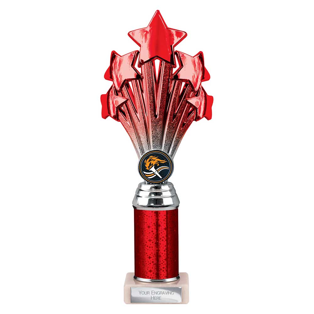 Featuring a five-star design in a red and silver finish, the trophy is mounted on a red-effect tube column and finished with a square base. A circular centre holder allows for a sport or activity insert, while the base is fitted with an engraving plate suitable for names, dates, or award titles.