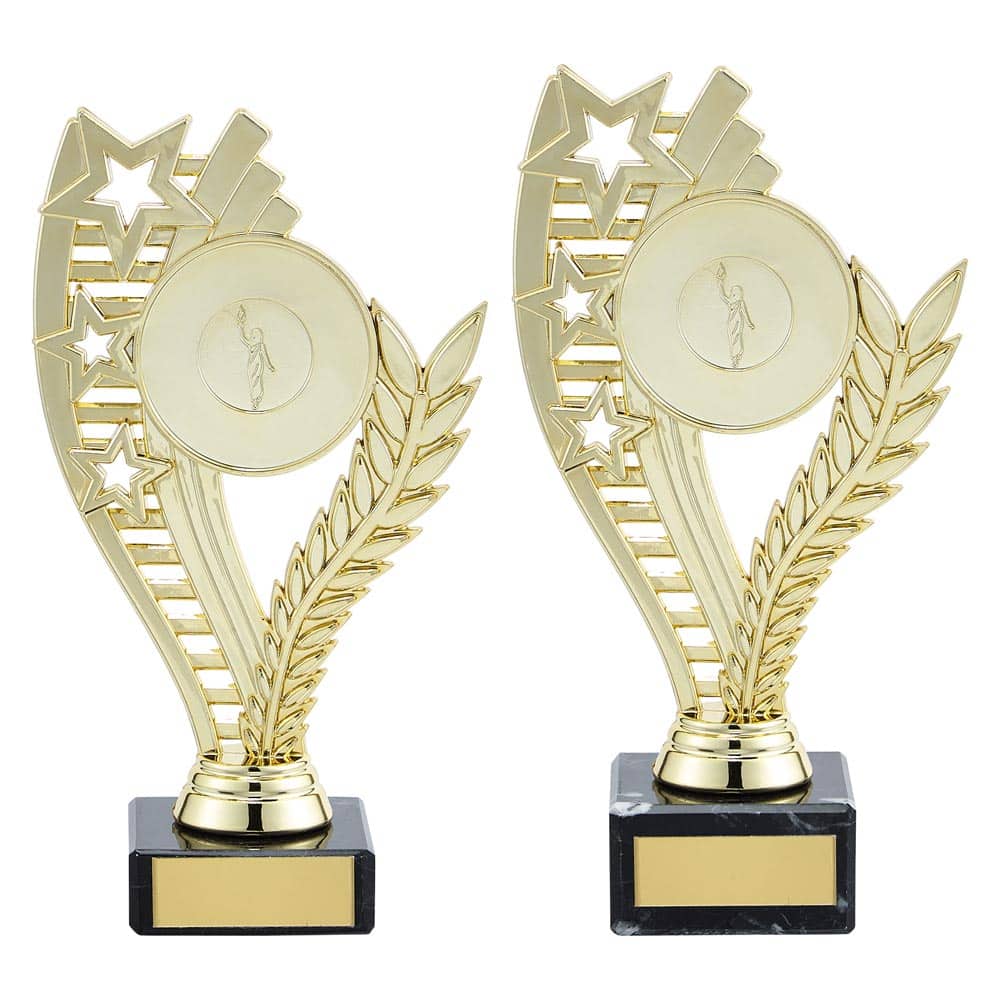 The Athena Multi Award Trophy Gold is a striking choice for any competition or achievement. Featuring a sleek gold design with star details and laurel leaves, it sits proudly on a solid marble base with a gold engraving plate. Perfect for all sports and activities, this trophy can be personalised to suit your event.