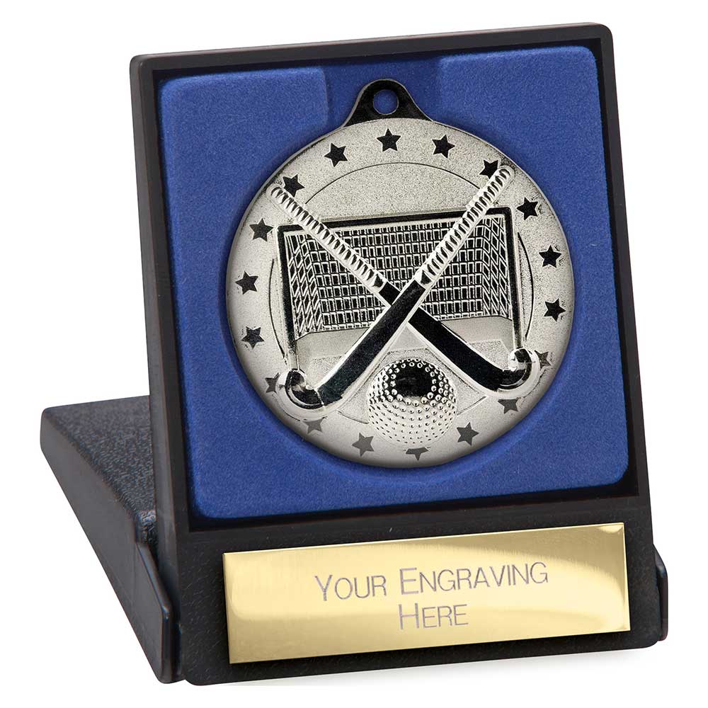 The metal medal features crossed hockey sticks and a ball, finished with a star-patterned border for a classic competitive look. The presentation box includes an engraving plate, allowing names, event details, or dates to be added for a personalised finish. Medal ribbons are available as an optional extra.