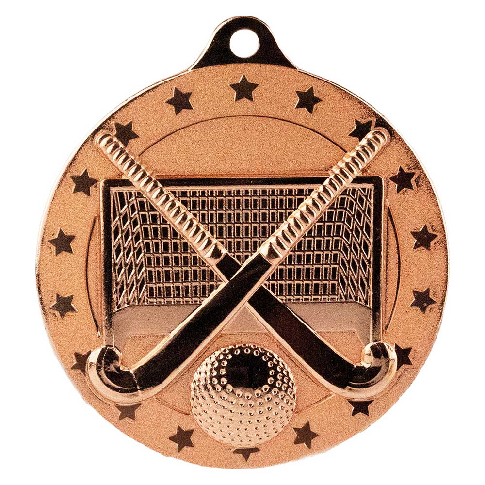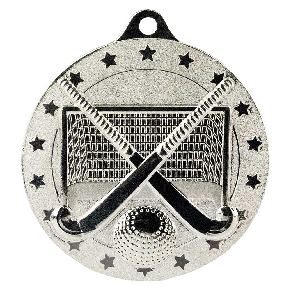 Made from metal, this medal features a detailed hockey design on the front, with crossed sticks and ball set against a goal backdrop, framed by a star-patterned border. Rear engraving is available for personalisation, allowing you to add names, team details, or event information. Medal ribbons and presentation boxes are available as optional extras.
