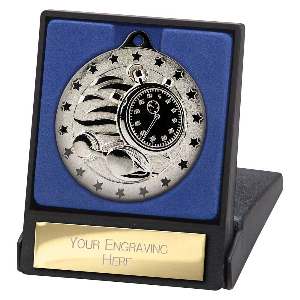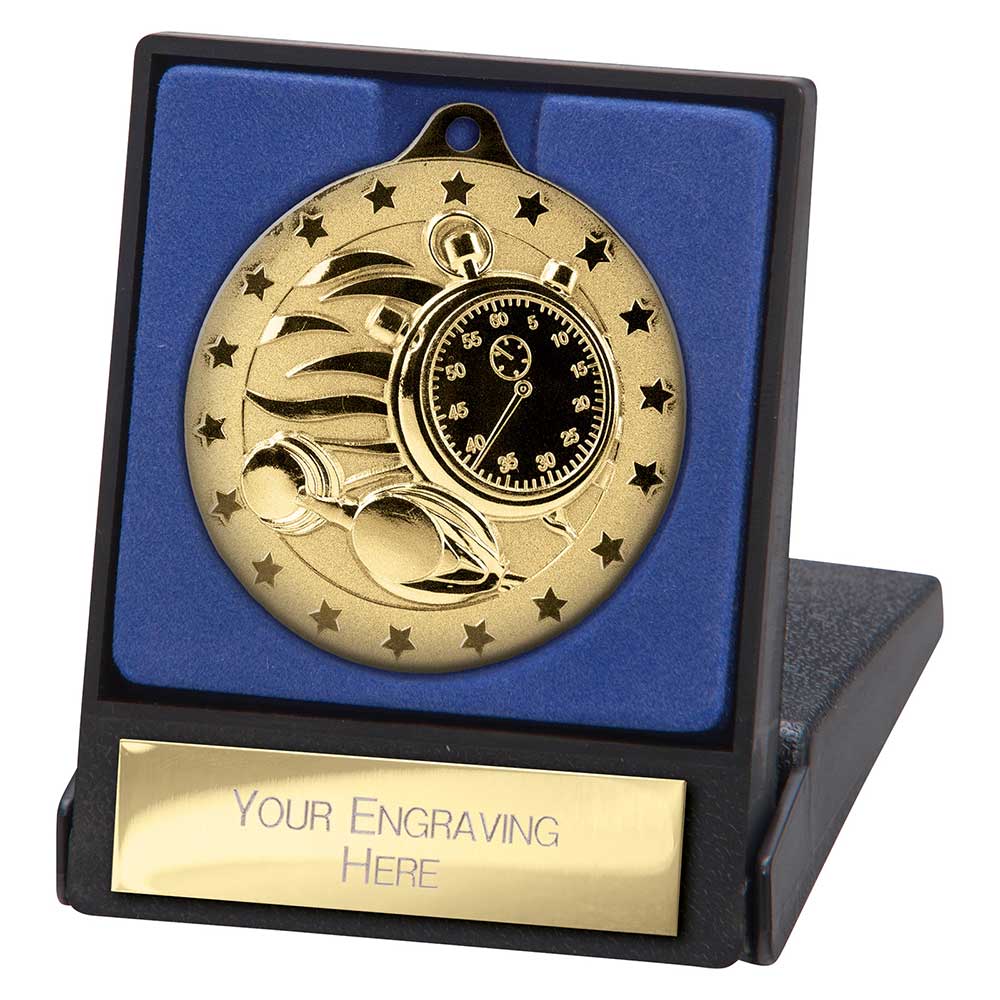 The metal medal features a stopwatch and swimming design with a surrounding star border, giving it a clean and recognisable sporting finish. The presentation box includes an engraving plate, allowing names, event details, or dates to be added for a personalised result. Medal ribbons are available as an optional extra.