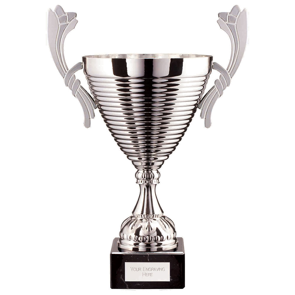 The Cascade Trophy Cup Silver is a sleek and modern choice for any sporting or achievement event. Available in five sizes, this striking silver cup features a ridged metal bowl with elegant curved handles, mounted on a solid marble base.