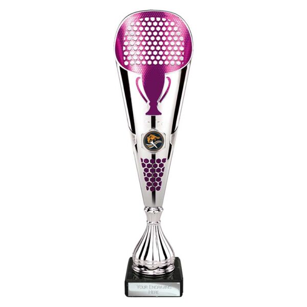This trophy features a silver cup-style design with purple detailing and textured accents for a contemporary look. A circular centre holder allows for a sport or activity insert, while the base is fitted with an engraving plate for personalised names, dates, or award titles.