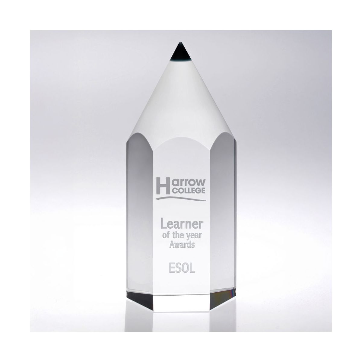 The Glass Pencil Award stands at 203mm and features a distinctive pencil-inspired design, making it the ideal choice for schools, colleges, and educational award ceremonies. With its sharp polished point and clean multi-faceted sides, this award is perfect for recognising academic achievement and student success.