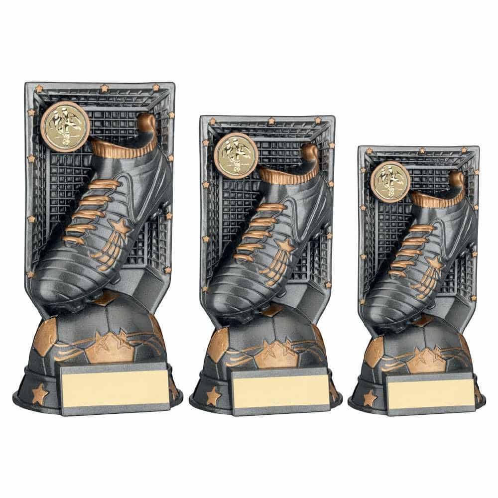 The Goal Raider Football Trophy is a bold, modern award featuring a detailed football boot set against a goal backdrop with star detailing. Available in three sizes (133mm, 165mm, and 203mm), it’s ideal for leagues, tournaments, and end-of-season presentations.