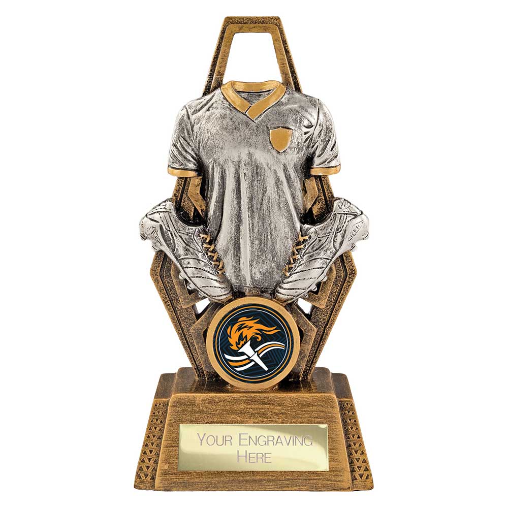 The Immense Football Trophy is a bold award available in three sizes – 130mm, 150mm, and 190mm. Featuring a detailed football shirt, boots and geometric frame, it’s an eye-catching choice for football presentations of all levels.
