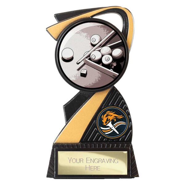 The trophy features a snooker themed insert set within a circular frame, combined with contrasting metallic finishes for a modern look. A gold engraving plate is included on the front, providing space for personalised engraving.