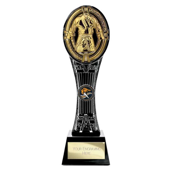 Featuring a detailed martial arts gi design set within a gold-effect oval frame, the trophy is finished with a contrasting black and silver tower body. It is made from weighted plastic and includes a gold engraving plate on the base, allowing you to personalise each trophy with names, dates, or award titles.