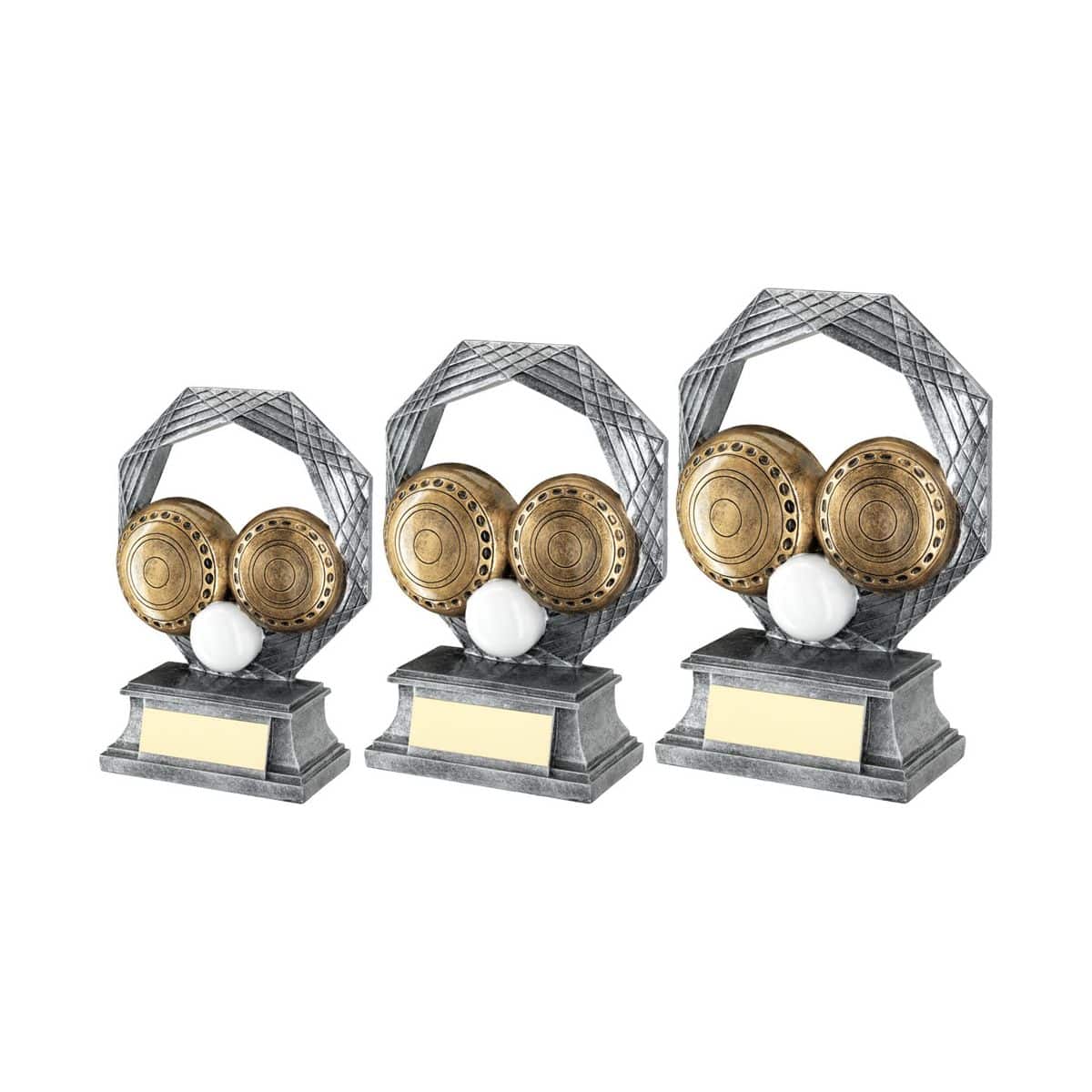 Featuring a bold octagonal frame design with detailed lawn bowls elements, the Octane Trophy has a contemporary silver and bronze finish that stands out on any presentation table. It is made from resin and mounted on a solid base, complete with a circular centre holder and an engraving plate for personalised text.