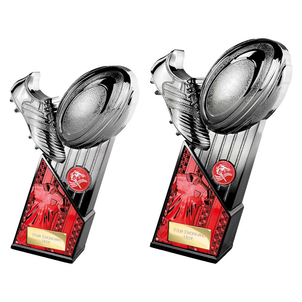 The Marauders Red Shirt Rugby Trophy is a bold and modern award, designed to recognise rugby achievement with a striking black and gunmetal finish and a red shirt detail. Its angular shape and layered design make it a strong choice for match awards, presentations, and end-of-season events.