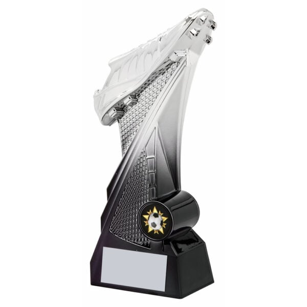 The Velocity Football Trophy in Silver and Black is a bold and energetic award choice for any football achievement. Available in three sizes, this eye-catching design features a Silver football boot striking out from a textured black and Silver backdrop, creating a strong sense of motion and power.