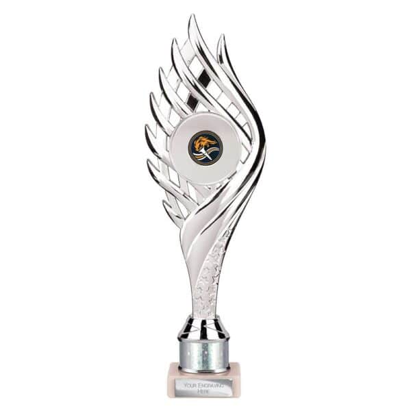 Featuring the flowing flame-style Wildfire design in a silver finish, the trophy is mounted on a silver-effect tube column and finished with a square base. A circular centre holder allows for a sport or activity insert, while the base is fitted with an engraving plate suitable for names, dates, or award titles.